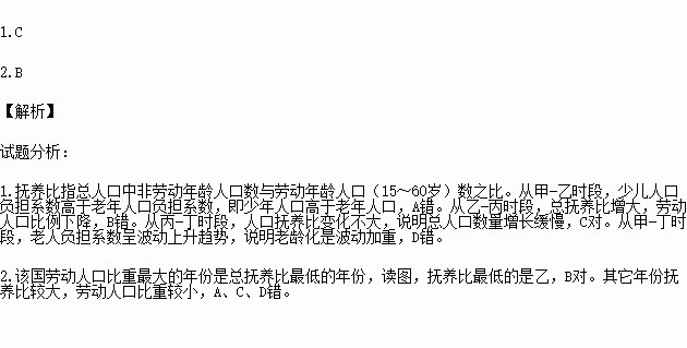 A.甲-乙:少儿人口少于老年人口 B.乙-丙:劳动人口比例上升