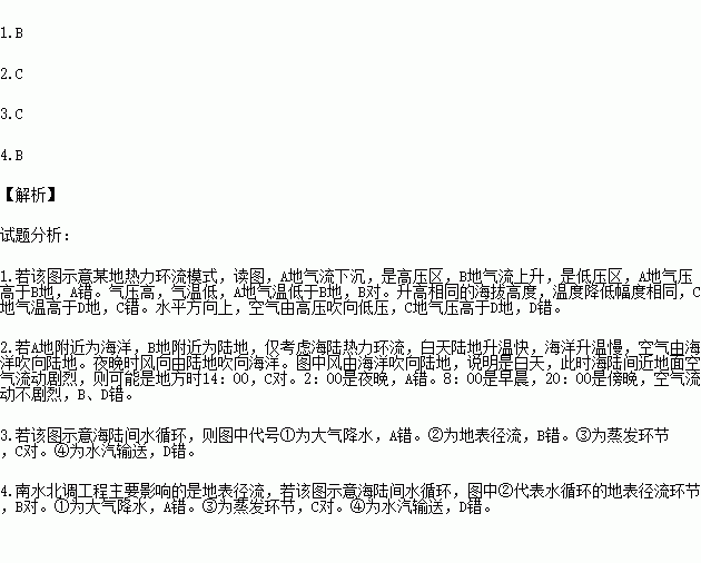 2.若A地附近为海洋,B地附近为陆地,此时海陆间近地面空气流动剧烈,仅考虑海陆热力环流,则可能是地方时( )