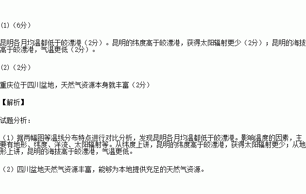 (1)比较昆明与皎漂港月均温的差异,并分析原因。(6分)