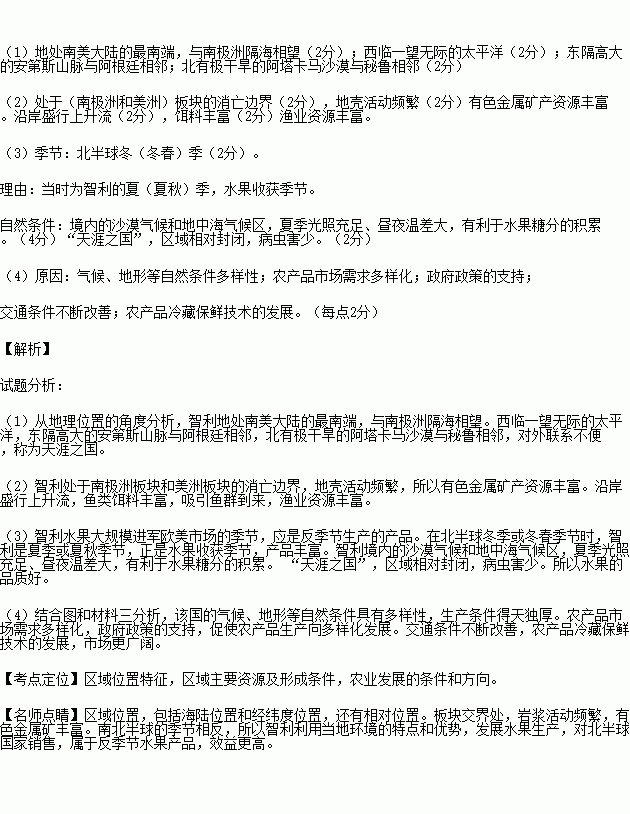 (3)结合材料三和所学知识,推断说明智利水果大规模进军欧美市场的季节。分析智利水果品质好的自然条件。