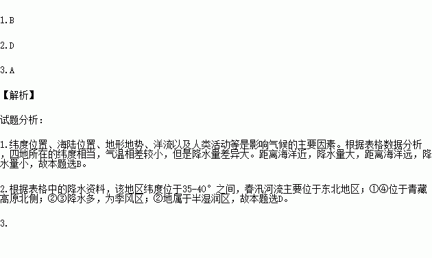 下表是我国北纬35°—40°之间大陆上四地的气候资料,回答下列各题。