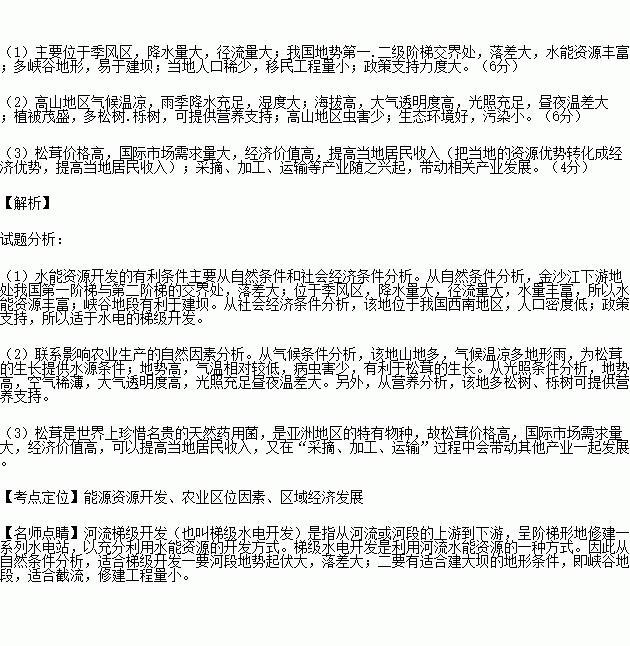 材料三 “金沙江下游河段梯形水电站规划及香格里拉松茸产区示意图”。