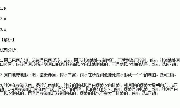 “千湖沙漠”国家公园位于巴西东北部滨海地区,沙丘从海岸边一直向内延伸50公里,洁白的新月形沙丘链镶嵌着上千个晶莹剔透、水位季节变化明显的湖泊。读图回答下题。