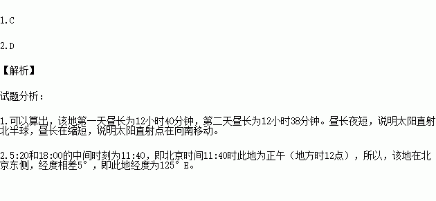 读“我国某地连续两天日出、日落时刻(北京时间)表”。据表完成下列各题。
