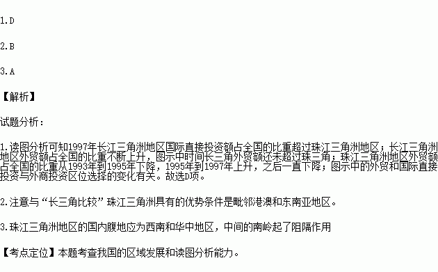 读该图“珠江三角洲与长江三角洲地区国际直接投资和外贸额所占全国比重的变化图”,回答下列问题。