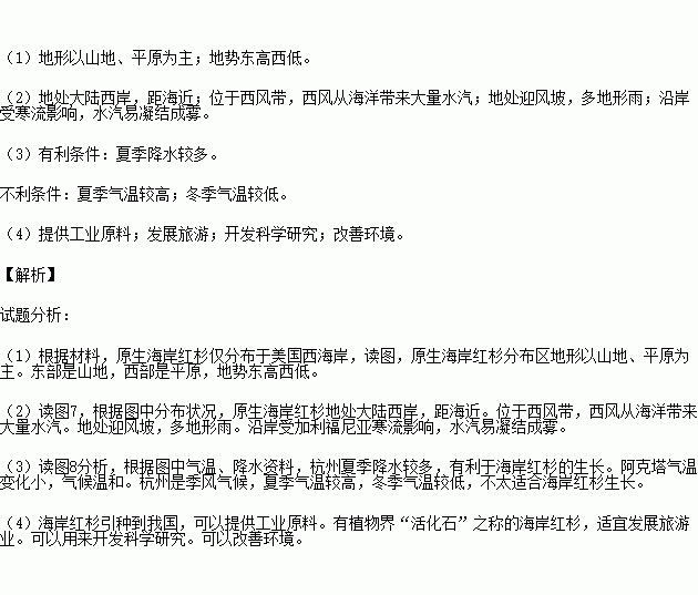 (2)分析原生海岸红杉分布区多雨、多雾的原因。