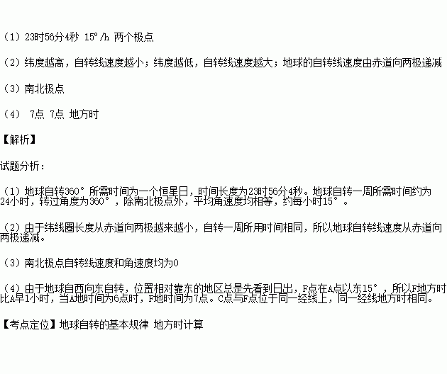 (1)地球自转一周360º所需要的时间是 ,地球自转的角速度大约是 ,除 外,各地角速度相等。
