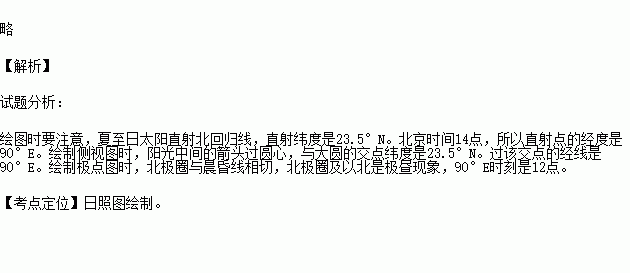在下列给出的图上绘出:夏至日北京时间为14:00时太阳日照图(从赤道观察的侧视图),并且将绘制的侧视图转绘成南极上空俯视图,并标出能说明题目要求的经纬度。