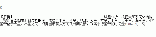 下图为旅行者2号探测器飞行线路和日程示意图,旅行者2号于1977年8月20日从肯尼迪航天中心成功发射升空。据图可推测它飞离小行星带时间约在