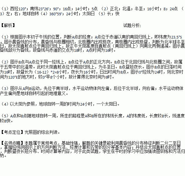 £¨2£©BµãÔÚAµãµÄ ·½Ïò£¬´¦ÓÚÎå´øÖÐµÄ ´ø£¬ÕýÖµ £¨½ÚÆø£©£¬Ò¹³¤ Сʱ£¬µ±BµãÈÕ³öʱÊǵ±µØ ʱ£¬¶ø´ËʱµÄ¡°±±¾©Ê±¼ä¡±Êǵ±ÌìµÄ µãÖÓ¡£