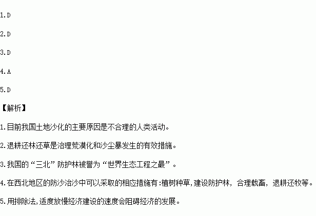 土地沙漠化是我国最严重的生态环境问题之一。尽管党和政府对治理沙漠化工作给予了极大的关注,但由于对森林的乱砍滥伐,对草地的盲目垦耕、超载放牧等,土地沙漠化“局部好转,整体扩大”的趋势仍未改变。据此完成下题。