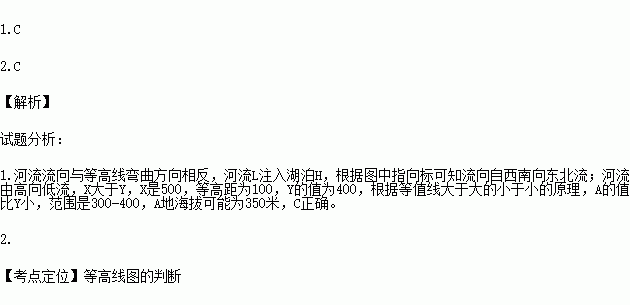 下图为北半球某陆地局部图,图中X、Y为等高线(等高距为100米),X数值为500米,L为河流,H为湖泊。据此回答下列小题。