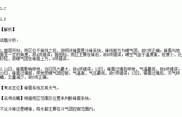A.锋面与地面平行 B.雨区主要在锋前