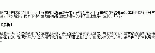 结合材料,解释2015年9、10月份阿塔卡马沙漠出现花海的原因。