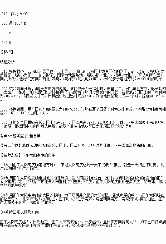 如图为我国某地旗杆夏至日这天影子长度模式图。a、b、c、d表示不同地方时刻的日影影长。b、d影长达一天中最大;a与b、a与d两线间夹角相等;a与c两线间夹角为45°,若该地昼长为14时40分,回答下面问题。(12分)