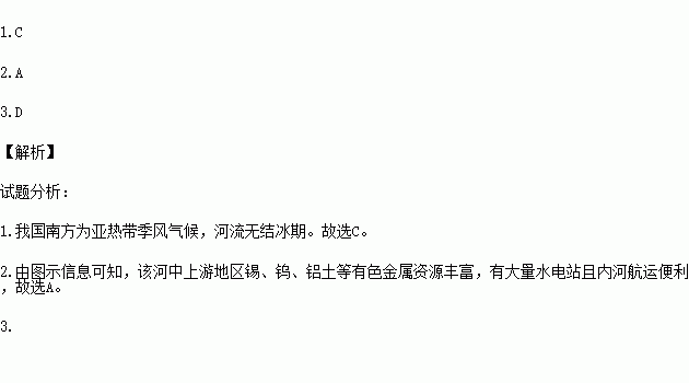 2.图中河流流域中上游重点发展了有色金属冶炼工业,其主要的区位优势是①有色金属原料丰富②廉价水电③经济发达,基础好④科技发达⑤廉价水运