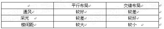(3)该大型居住区楼房有平行布局、交错布局等,试对两种布局的住宅通风、采光、楼间距进行比较。