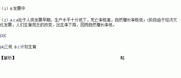(4)目前我国人口增长模式接近“__________模式”即基本实现图中_________阶段向_________阶段(填字母)的转变。这种转变主要是因为我国大力开展_________工作而取得的。