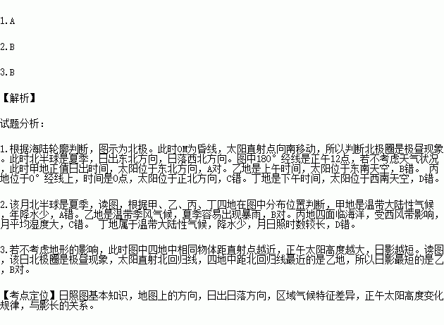 1.若不考虑天气状况,此时下列四地太阳方位的判断正确的是