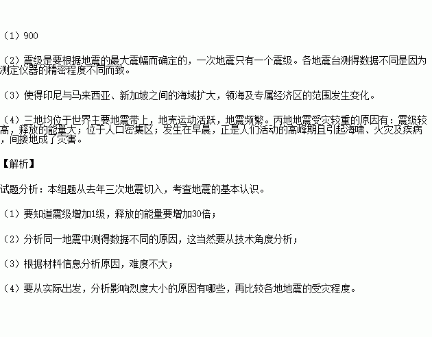 (2)2月26日的印尼地震,中国地震台网测定震级为里氏8.7级,而美国地震监测网测定为9级。因此有人说一次地震有多个震级,请谈谈你的看法。