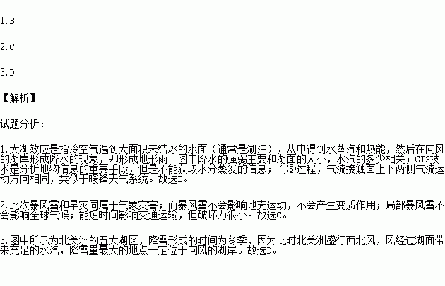 大湖效应是指冷空气遇到大面积未结冰的水面(通常是湖泊),从中得到水蒸汽和热能,然后在向风的湖岸形成降水的现象。受大湖效应影响,2014年美国部分地区遭受罕见的暴风雪。图(a)为某次暴风雪形成过程示意图。图(b)为某区域地图。读图,回答下列问题。