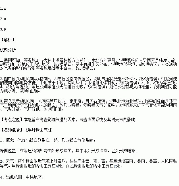 1.影响等温线d、e呈现东西延伸的主导因素是( )