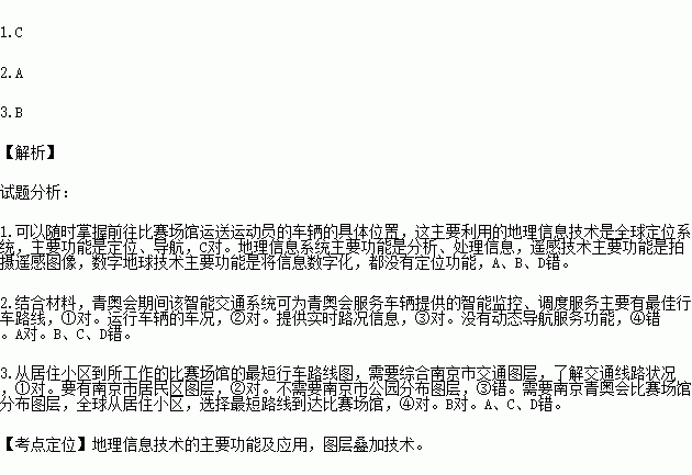3.ÄϾ©µÄÖÇÄܽ»Í¨¹ÜÀíÊÇδÀ´ÄϾ©³ÇÊйÜÀíGISµÄ¾ßÌå±íÏÖ£¬Í¨¹ýͼ²ãµþ¼Ó¿É»ñÈ¡³ÇÊн»Í¨ÐÅÏ¢¡£Çà°Â»áÆÚ¼äΪ¹¤×÷ÈËÔ±ÌṩµÄ´Ó¾Ó×¡Ð¡Çøµ½Ëù¹¤×÷µÄ±ÈÈü³¡¹ÝµÄ×î¶ÌÐгµÂ·Ïßͼ£¬ÊÇ×ÛºÏÁËÏÂÁÐ____¶ø»ñµÃµÄ