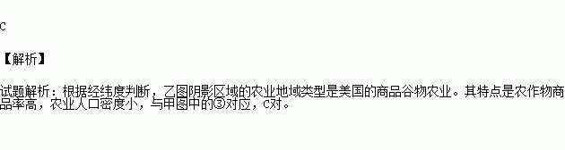 若甲图中X轴代表农业人口密度,Y轴代表农作物商品率,则乙图阴影区域的农业地域类型与①、②、③、④相对应的是( )