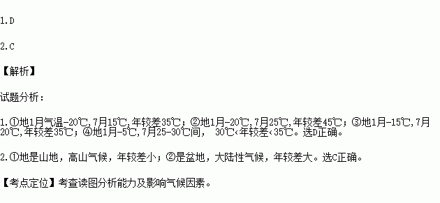 2.造成①②两点气温年较差明显不同的最主要因素是