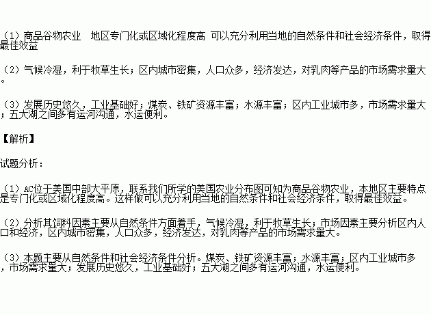 (1)图中AC所在区域所属的农业地域类型是 ,图中显示出美国农业生产的特点 ,这样做的好处是 。