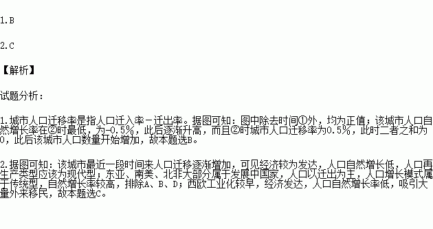 下图是某城市人口迁移率与自然增长率曲线图,读图完成下列各题。