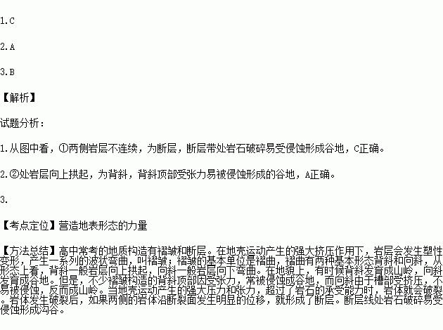 A.背斜顶部受外力侵蚀而形成的谷地 B.岩层断裂下陷形成