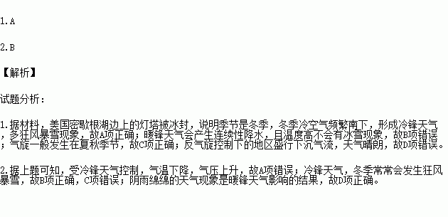 2014年初,美国密歇根湖边上的灯塔被冰封,出现似电影《后天》的场景。读图,完成下列问题。