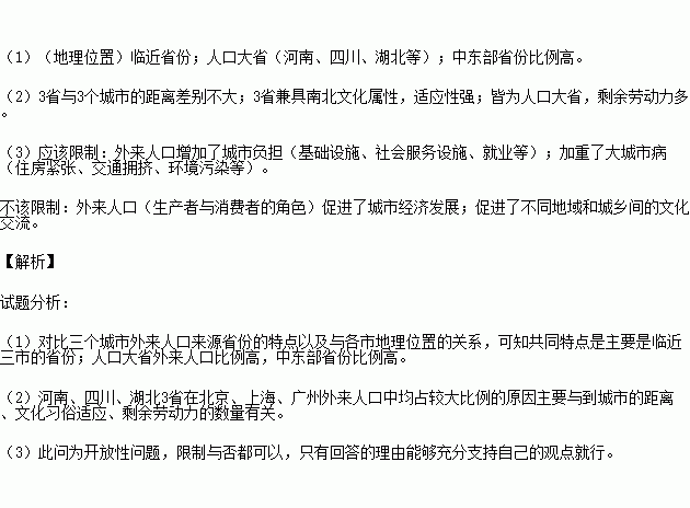 £¨2£©·ÖÎöºÓÄÏ¡¢ËÄ´¨¡¢ºþ±±3Ê¡ÔÚ±±¾©¡¢ÉϺ£¡¢¹ãÖÝÍâÀ´ÈË¿ÚÖоùÕ¼½Ï´ó±ÈÀýµÄÔÒò¡£