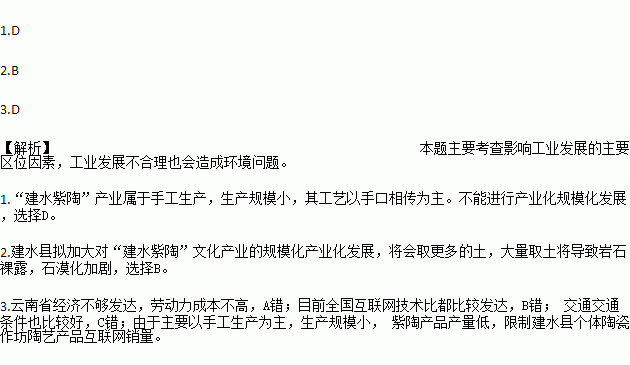 “建水紫陶”是云南省建水县的汉族传统手工艺品,始于元末明初,为中国四大名陶之一。其主要用建水近郊五色陶土(红黄青褐白)制作成型,经过书画、雕刻、填刮、烧炼、磨光等工序。“建水紫陶”是以心手感应的手工拉坯为成型工艺,其工艺以手口相传为主。目前“建水紫陶”文化产业仍以个体作坊生产经营为主,并未形成产业化、规模化效应。据此完成下列问题。