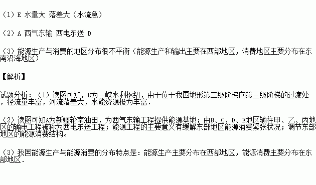 (2)图中属于重点开发的石油、天然气能源基地是_________(填字母),由该基地向乙地区输送能源的工程被称为__________________ ,由B 、C 、D 、E 地区输往甲、乙、丙地区的输电工程被称为_________ 。建设这些能源工程的主要意义在于( )