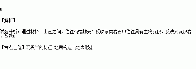 沈括的《梦溪笔谈》记载:“太行而北,山崖之间,往往衔螺蚌壳……横亘石壁如带”。文中所记载地区的岩石,按成因分,可能属于