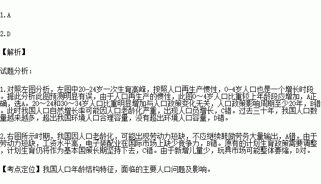 2013年11月,中共十八届三中全会决定启动实施一方是独生子女的夫妇可生育两个孩子的政策。2014年6月,某校地理学习兴趣小组依据我国第六次人口普查年龄结构(左图),在现行人口政策和生育观念不变的前提下对我国2040年人口年龄结构进行了粗略预测,并绘制了2040年我国人口年龄结构金字塔图(右图),读图完成下列各题。