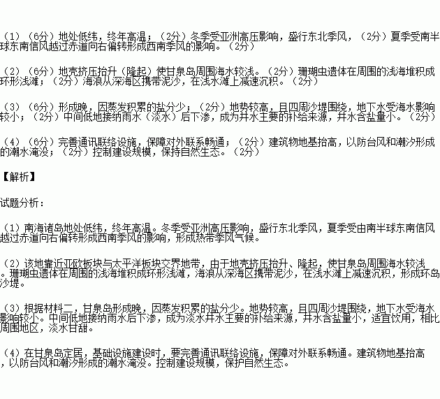 材料二:甘泉岛a匕纬16030',东经1 1 1035 7)位于中国西沙群岛永乐环礁上,在珊瑚岛西南2海里处,岛上有中国最南端的文物保护单位.—。c西沙甘泉岛唐宋遗址,,。甘泉岛是西沙群岛中出露最晚的岛,地势较高,四周为沙堤围绕,岛中心由溺湖干涸演化形成平地,周围珊瑚礁环绕;岛上有一口古井,井水清澈甘甜适宜使用,也是西沙为数不多具有淡水的岛屿。