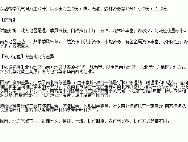 请在表中填出我国南方与北方地区的差异