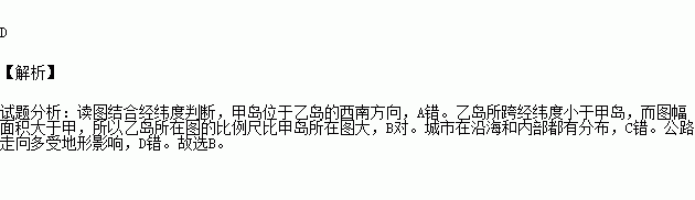 A.甲岛位于乙岛的东南方向 B.乙岛所在图的比例尺比甲岛所在图大