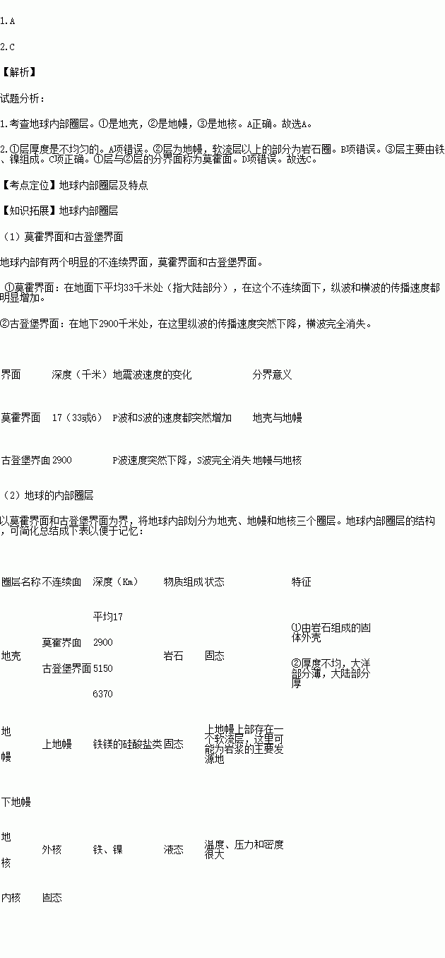 D.①层与②层的分界面称为古登堡面