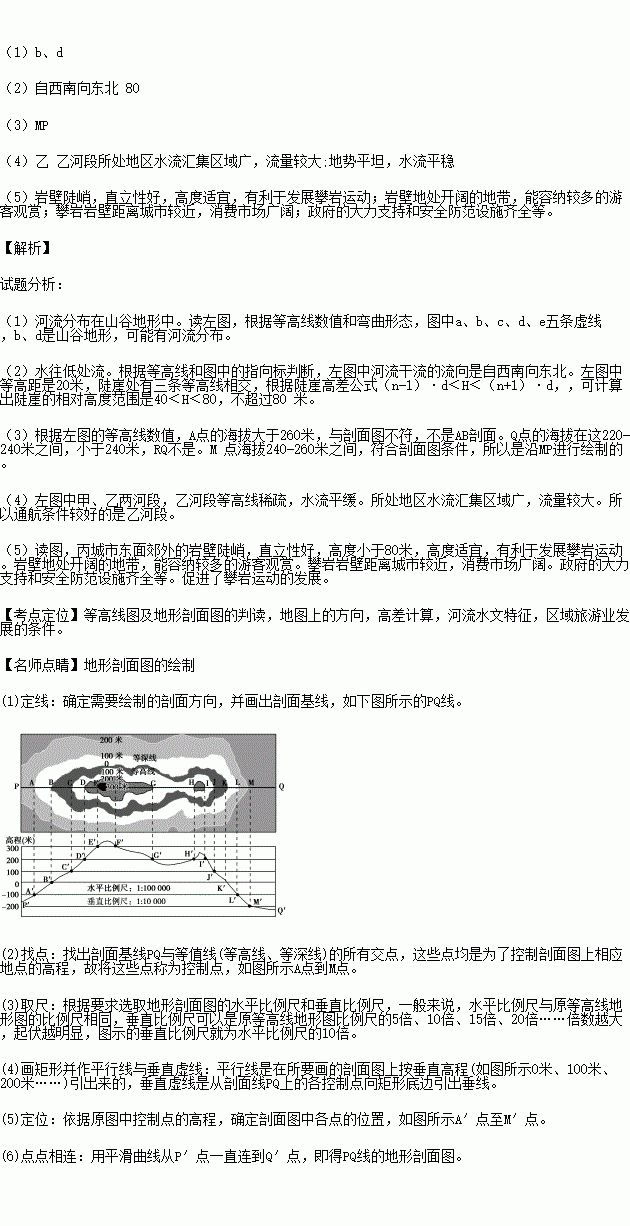 材料一 攀岩运动是利用陡峭岩壁的凸起、凹陷、缝隙等自然条件进行攀登运动方式。近年来我国的攀岩运动发展迅速,大大推动了城市的旅游业发展,提高了城市的品位和形象。读左图我国某地区等高线分布图和右图地形剖面图回答下列问题。(10分)