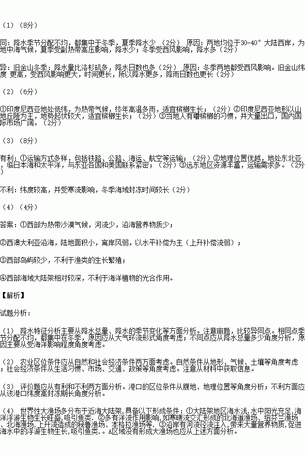 (4)(4分)图中A区域与B区域纬度位置和海陆位置相同,B区域形成了世界著名的秘鲁渔场,而A区域并没有形成大渔场,请分析其可能成因。