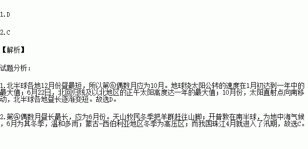 下图是北半球某地一年中6个偶数月昼长(本月昼长之和,单位小时)曲线分布图,读图完成下列问题。