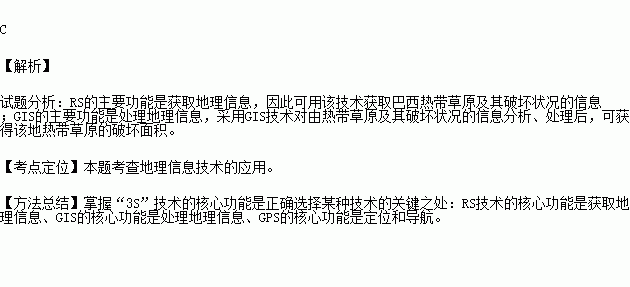 巴西每年约有2万平方千米的热带草原被破坏。环保人士指出,必须严格制止破坏草原的行为,有效利用现有的农业用地。调查并估算巴西热带草原的破坏面积,采用的地理信息技术是( )