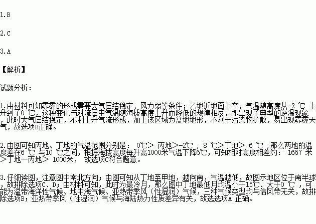 2.仅考虑海拔对气温的影响,丙、丁两地的相对高度可能是( )