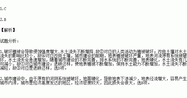 读某地四种不同人类活动对水土流失影响示意图(图中四条曲线所表示的是退耕还林、改良土壤、植被破坏、城市建设),完成下列问题。