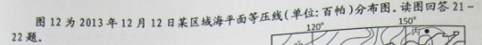如图为2013年12月12日某区域海平面等压线(单位:百帕)分布图,读图回答21-22题.