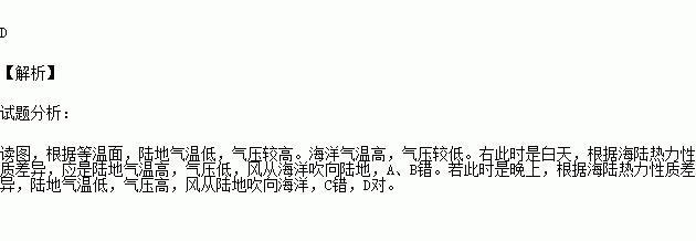 D. 此时是晚上,风从陆地吹向海洋